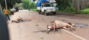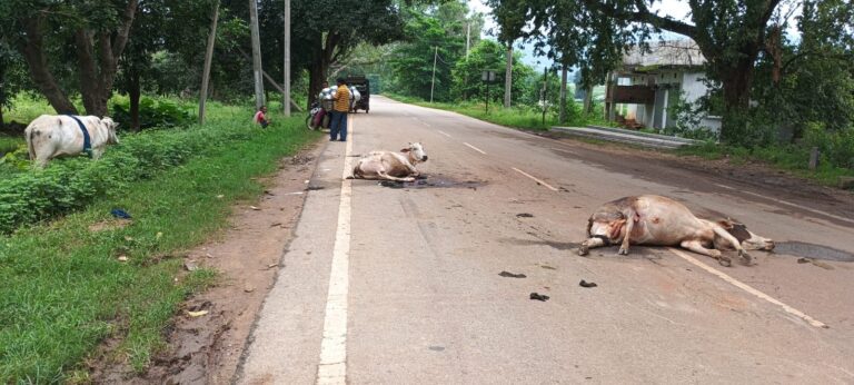 बिशुनपुर (गुमला) : प्रखंड क्षेत्र अंतर्गत बिशुनपुर एसएस हाई स्कूल जाने वाली मुख्य सड़क पर मंगलवार सुबह करीब 5:00 बजे एक दर्दनाक हादसा हो गया। एक तेज रफ्तार अज्ञात बॉक्साइट लदे ट्रक ने सड़क किनारे चल रहे तीन मवेशियों को कुचल दिया। हादसे में एक मवेशी की मौके पर ही दर्दनाक मौत हो गई, जबकि दो अन्य मवेशी गंभीर रूप से घायल हो गए हैं।