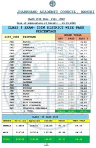 रांची: झारखंड एकेडमिक काउंसिल (JAC) द्वारा घोषित कक्षा 8वीं के बोर्ड नतीजों में राजधानी रांची ने अपनी शैक्षणिक श्रेष्ठता का लोहा मनवाया है। रांची जिला पूरे प्रदेश में 96.8 प्रतिशत की शानदार पासिंग रेट के साथ प्रथम स्थान पर रहा है। यह सफलता इसलिए भी खास है क्योंकि पिछले साल रांची दूसरे पायदान पर था, लेकिन इस बार जिला प्रशासन और शिक्षा विभाग की सुनियोजित रणनीति ने इसे ‘चैंपियन’ बना दिया।
