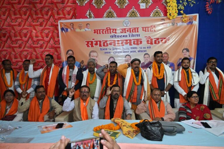 Koderama News: भारतीय जनता पार्टी जिला कोडरमा संगठन की एक महत्वपूर्ण बैठक गुरु कृपा विवाह भवन, कोडरमा में संपन्न हुई। बैठक की अध्यक्षता जिला अध्यक्ष अनूप जोशी ने की, जबकि संचालन जिला चुनाव सह प्रभारी नीतीश चंद्रवंशी ने किया।