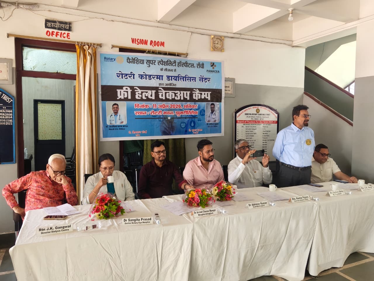 आई हॉस्पिटल की डॉक्टर संगीता प्रसाद को पुष्प गुच्छ इनर व्हील की अध्यक्ष ज्योति झा ने दिया । डायलिसिस के डायरेक्टर जय कुमार गंगवाल, रोटरी क्लब के अध्यक्ष संतोष सिन्हा महेश दारुका ने रोटरी के परमानेंट प्रोजेक्ट और उसके सेवा कार्यों को लोगों के बीच रखा अतिथि डॉक्टर को प्रतीक चिन्ह रोटेरियन सुरेश जैन एवं अनीता तर्वे ने दिया । धन्यवाद ज्ञापन डायलिसिस के सचिव रोटेरियन रतन शंघई ने दिया डायलिसिस सेंटर के अध्यक्ष रोटेरियन कुमार पुजारा ने डायलिसिस सेंटर कोडरमा के द्वारा दिए जाने वाली सेवा को लोगों के बीच में बताया और कहा कि सेवा ही धर्म है इसी को ध्यान में रखते हुए यहां पर आने वाले डायलिसिस मरीजों की अच्छी प्रकार से और आधुनिक मशीनों के साथ सेवा प्रदान की जाती है जल्द ही आयुष्मान कार्ड से मरीज का इलाज किया जाएगा जिसकी प्रक्रिया जारी है पब्लिक रिलेशन के डायरेक्टर नवीन जैन ने कहा कि रोटरी क्लब कोडरमा जरूरतमंदों की सेवा के लिए कृत संकल्पित है आने वाले दिनों में प्रत्येक महीना डायलिसिस सेंटर में किडनी के विशेषज्ञ डॉक्टर के द्वारा जरूरतमंदों की सेवा के लिए कैंप लगाया जाएगा इस मौके पर पूर्व अध्यक्ष सुनीता पांडे अमित कुमार कमल सेठी सुरेश सेठी ज्योति पुजारा माला दारूका विपुल बगड़िया डायलिसिस के टेक्नीशियन विकास मंडल सुरेश कुमार रोटरी पब्लिक रिलेशन के डायरेक्टर नवीन जैन आदि लोग मौजूद थे