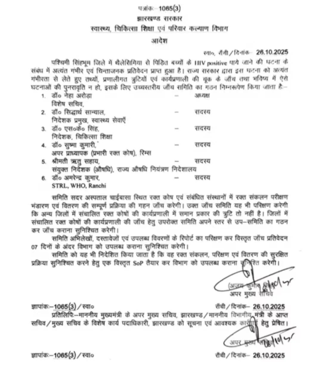 इस समिति की अध्यक्षता स्वास्थ्य विभाग की विशेष सचिव डॉ. नेहा अरोड़ा करेंगी। जांच समिति चाईबासा सदर अस्पताल के ब्लड बैंक सहित रक्त संग्रह, परीक्षण, भंडारण और वितरण की पूरी प्रक्रिया का गहन परीक्षण करेगी। 7 दिनों के भीतर विस्तृत जांच रिपोर्ट सरकार को सौंपने का निर्देश दिया गया है।