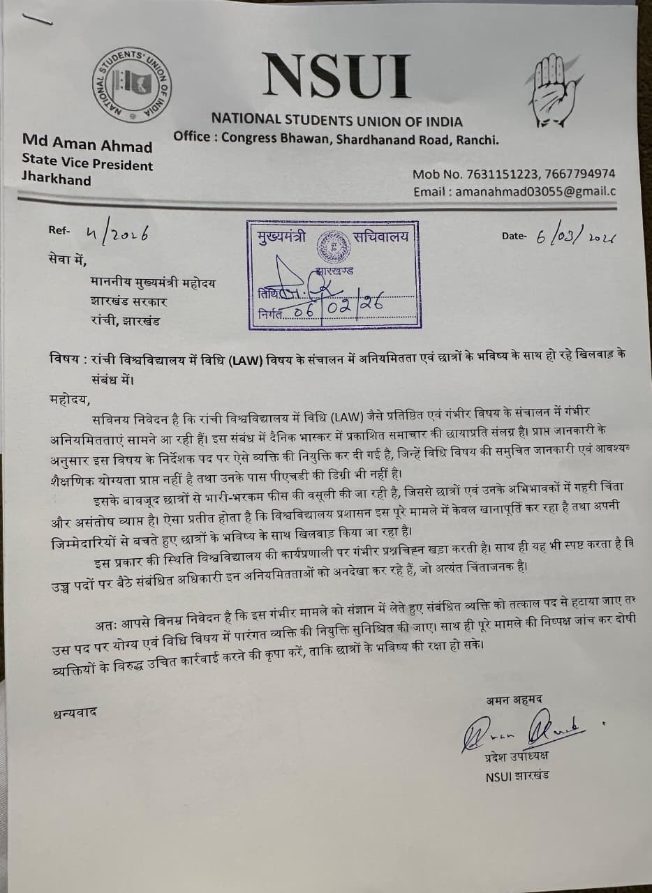 मामले की गंभीरता को देखते हुए NSUI ने झारखंड के राज्यपाल और मुख्यमंत्री से तुरंत हस्तक्षेप करने की मांग की है। संगठन ने एक औपचारिक मांग-पत्र सौंपते हुए निम्नलिखित बिंदुओं पर जांच की अपील की है: