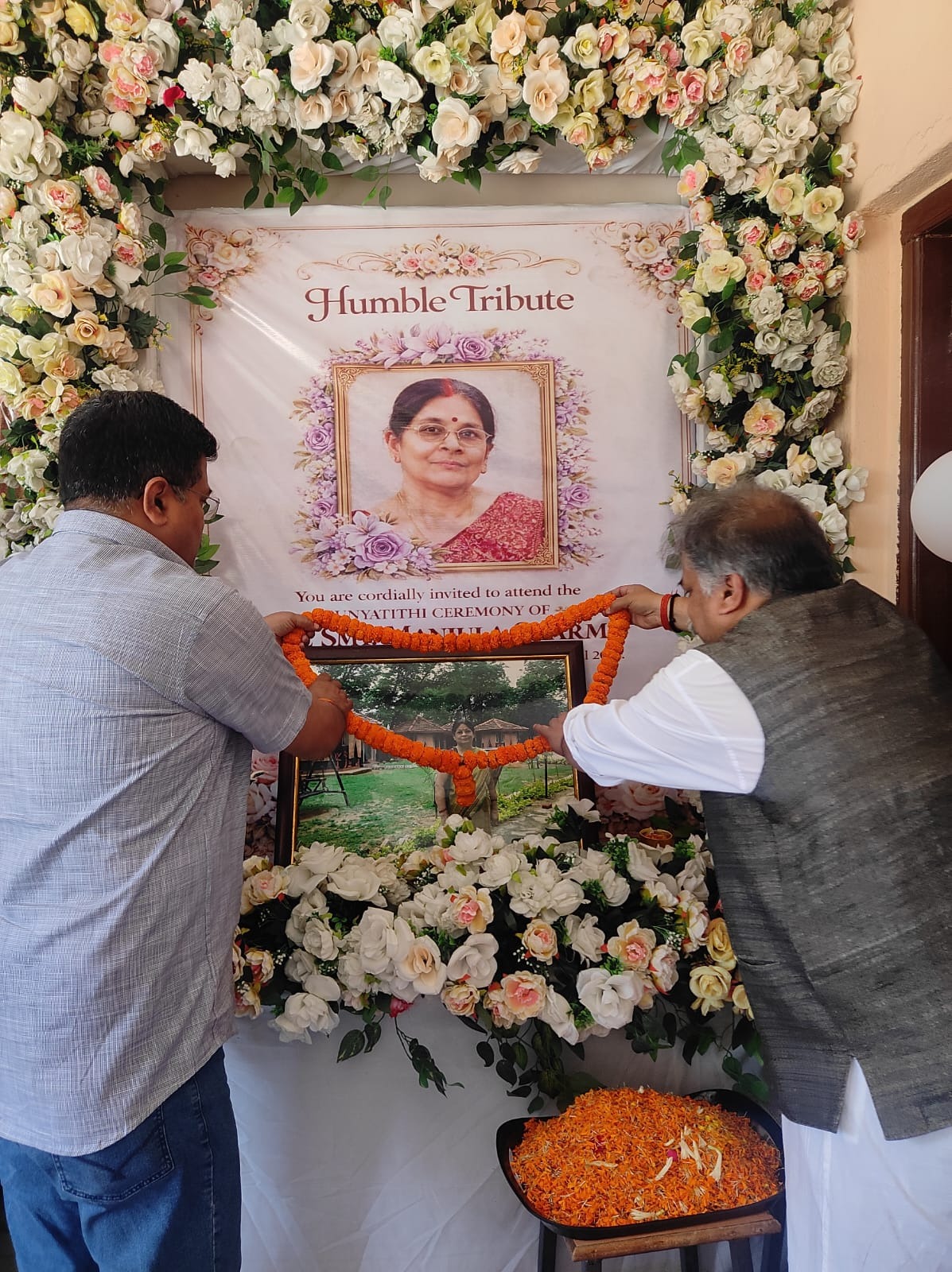 कार्यक्रम का शुभारंभ विद्यालय के निदेशक एवं स्वर्गीय मंजुला शर्मा के ज्येष्ठ पुत्र रजनीश जी द्वारा अपने अनुज मनीष जी के साथ उनकी तस्वीर पर माल्यार्पण कर किया गया। इसके पश्चात मुख्य अतिथि मधुलिका देव (सेवानिवृत्त विश्वविद्यालय प्रोफेसर, विनोबा भावे विश्वविद्यालय) एवं रत्नेश्वरी प्रसाद नारायण देव ने पुष्प अर्पित कर श्रद्धांजलि दी।