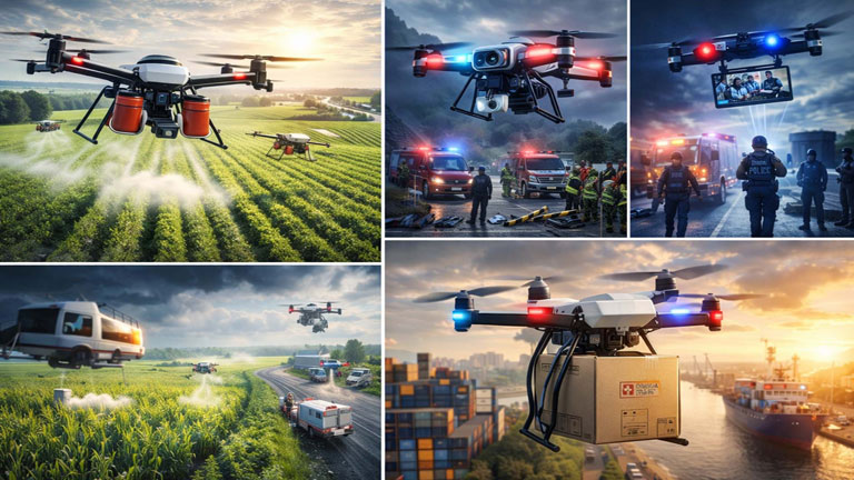 ड्रोन अब 5G और एआई की ताकत से लैस होकर 40 से 50 किलोमीटर तक बिना सिग्नल के उड़ान भरने में सक्षम होंगे। ये बिना जीपीएस के भी काम कर सकेंगे और जैमर को चकमा देने की काबिलियत रखेंगे। इसके अलावा ऊंची इमारतों की सफाई, पेंटिंग और बिजली की लाइनों की मरम्मत जैसे जोखिम भरे काम भी अब इंसानों की जगह ड्रोन करेंगे, जिससे जान-माल का जोखिम कम होगा। दूरदराज के इलाकों में मेडिकल सप्लाई पहुंचाने के लिए भी ड्रोन का इस्तेमाल बढ़ाया जाएगा।