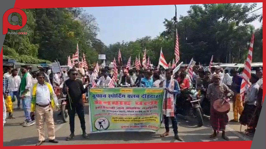 Dhanbad : झारखंड में कुर्मी समाज को अनुसूचित जनजाति (एसटी) सूची में शामिल करने की मांग के विरोध में सोमवार को आदिवासी समाज ने जोरदार प्रदर्शन किया। हजारों की संख्या में आदिवासी पुरुष और महिलाएं पारंपरिक वेशभूषा में तीर-धनुष, ढोल-नगाड़ों और नारेबाजी के साथ सड़कों पर उतरे।