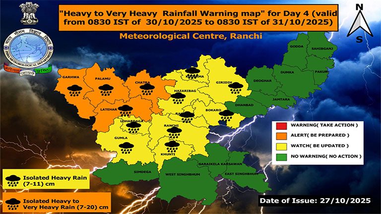 आईएमडी ने बताया कि मंगलवार को झारखंड के दक्षिण-पश्चिमी जिलों में भारी बारिश हो सकती है। बुधवार को दक्षिणी और उत्तर-पूर्वी हिस्सों में, गुरुवार को पश्चिमी उत्तरी और मध्य जिलों में तथा शुक्रवार को उत्तर-पूर्वी जिलों में भारी वर्षा की संभावना है।