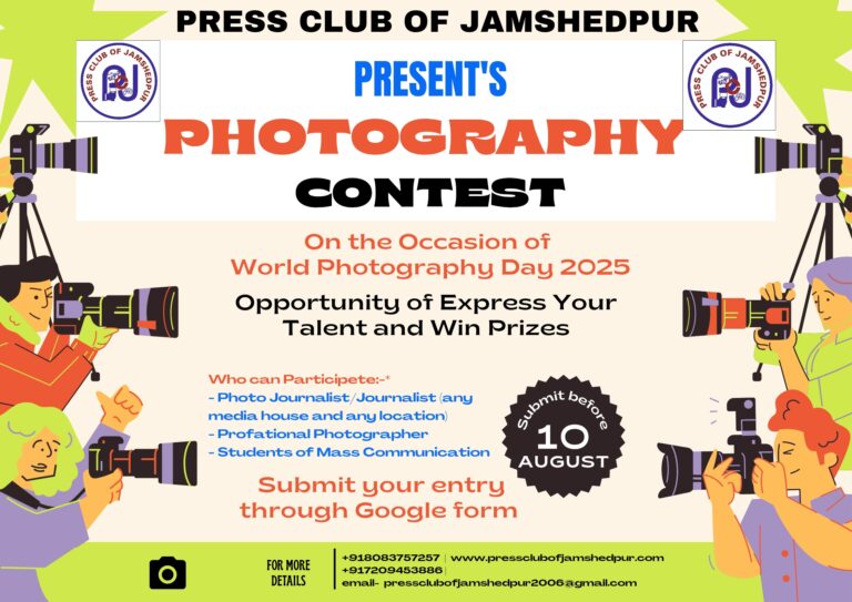 – प्रेस क्लब ऑफ़ जमशेदपुर वर्ल्ड फोटोग्राफी डे 2025 के उपलक्ष्य में आयोजित कर रहा है प्रतियोगिता