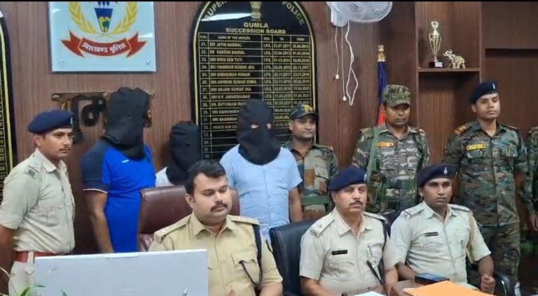 Gumla News : भरनो थाना क्षेत्र के बरंदा गांव में जमीन विवाद को लेकर हुए गोलीकांड मामले को गुमला पुलिस ने महज 24 घंटे के भीतर सुलझा लिया है। पुलिस अधीक्षक हारिश बिन जमा ने शुक्रवार को प्रेस कॉन्फ्रेंस कर जानकारी देते हुए कहा कि इस घटना में शामिल तीन आरोपियों को हथियार समेत गिरफ्तार कर लिया गया है। गिरफ्तार आरोपियों के पास से एक छः चक्रीय रिवॉल्वर, 23 जिंदा कारतूस, 4 खाली खोखे, घटना में प्रयुक्त मोटरसाइकिल और चार मोबाइल फोन बरामद किए गए हैं।