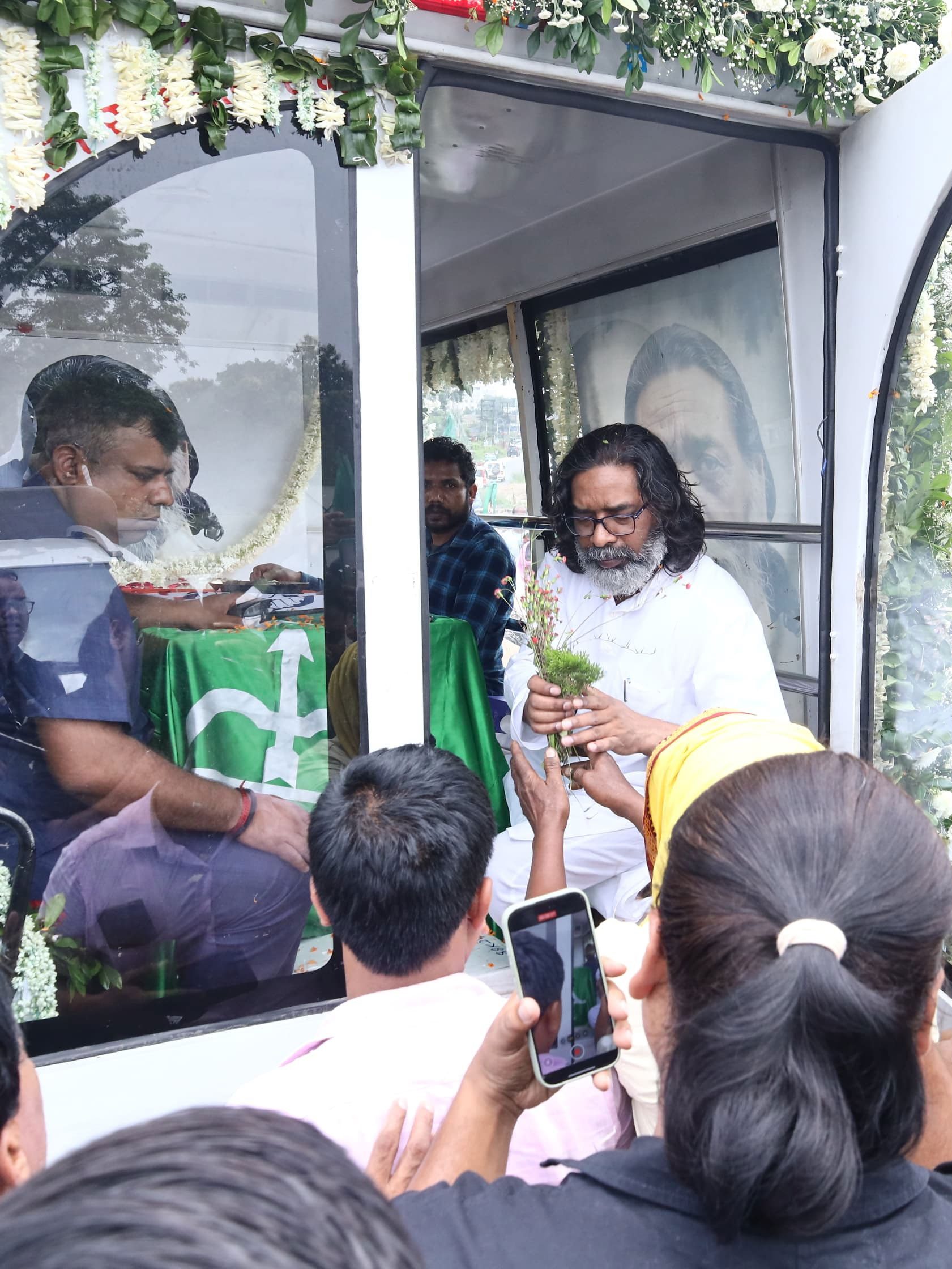 दिशोम गुरु शिबू सोरेन के पार्थिव शरीर को रांची से नेमरा ले जाने के दौरान झारखंड आंदोलन के पुरोधा को अंतिम विदाई देने के लिए जनसैलाब उमड़ पड़ा।